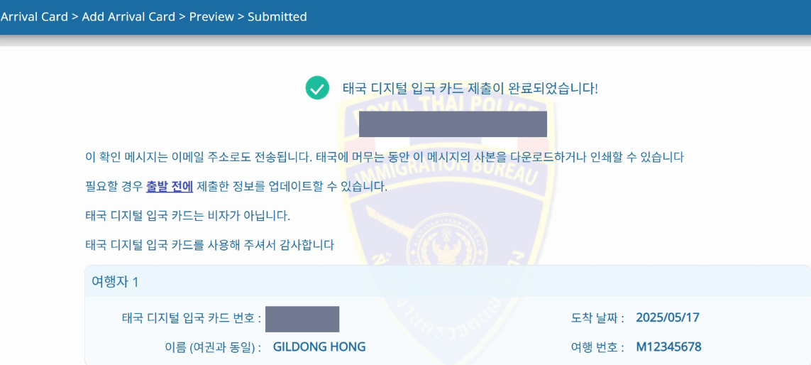 제출 완료 후 최종 완료된 입국카드번호를 확인 하실 수 있습니다.