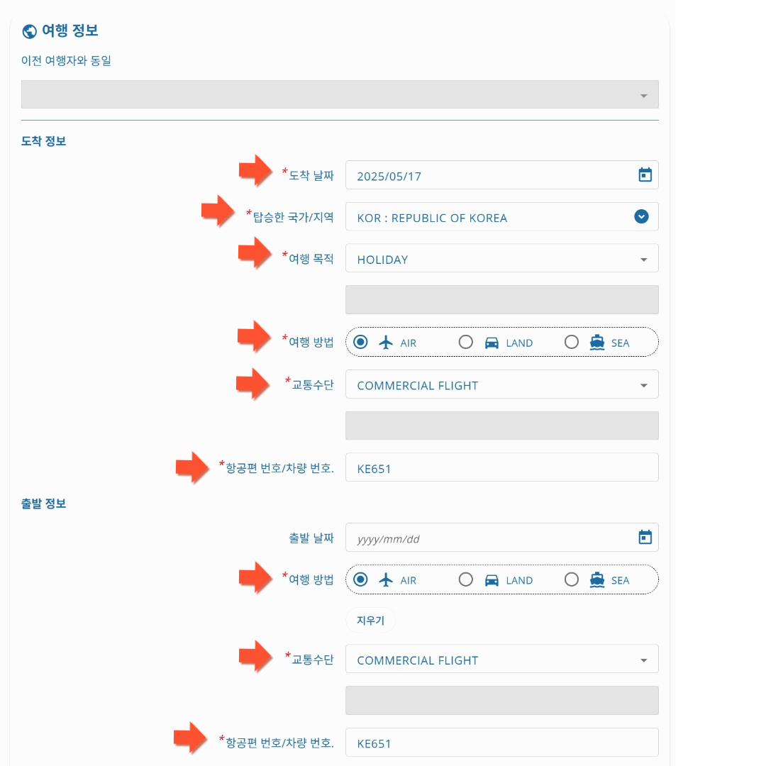 * 출발정보의 여행방법/교통수단/항공편 번호/차량번호 는 위 도착정보에 입력해준 내용과 동일하게 적어줍니다.